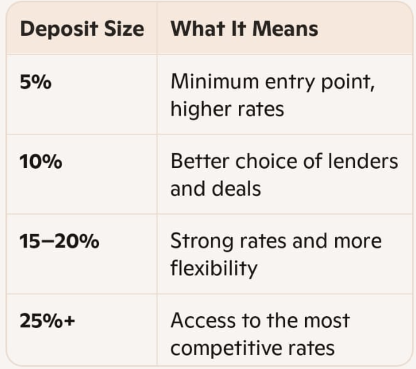 Most lenders require a minimum 5% deposit, but the more you can put down, the better your mortgage rate is likely to be. Here’s a quick breakdown: